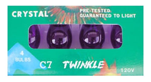 C-7 Purple transparent replacement bulbs for, The C-7 Purple Transparent Replacement Bulbs for Twinkle Lights or Blinking Lights come in a pack of 4. The Purple Transparent Replacement Christmas Light Bulbs for twinkle lights or blinking lights are rated for USA 120 volts and the replacement twinkle Christmas light bulbs use 7 watts of power. The replacement bulbs for twinkle lights are pre-tested and each of the twinkle lights is guaranteed to light. The twinkling lights Replacement Christmas Light Bulbs fit a C7 light bulb socket. The replacement bulbs are long life bulbs and the transparent replacement bulbs for the twinkling Christmas lights are USA UL approved. Christmas light safety instructions: When using Christmas replacement light bulbs for twinkling lights, basic precautions should always be followed including these safety tips for blinking lights and twinkle lights. Do not use the replacement bulbs for twinkling lights unless the twinkle lights are marked suitable for indoor and outdoor use. When outdoor replacement bulbs are used in outdoor applications, connect the outdoor lights to a ground fault circuit interrupting [GFCI] electrical outlets. Unplug the lights when leaving the house, when retiring for the night, or if the blinking lights are left unattended. Your replacement bulbs for the twinkle lights are not toys! The twinkle lights should not be played with or placed where small children can reach them. The replacement bulbs are equipped with threaded screw in replacement light bulbs. Make sure that you do not over tighten the replacement bulbs for blinking lights causing the protective glass covering to break or crack. Always unplug your twinkling Christmas lights before installing or replacing the replacement bulbs. Do not overload the electrical wiring that you are using the twinkle lights for. Only connect the recommended amount of twinkling Christmas light sets [usually three sets if not stated in the instructions] on one continues light string.